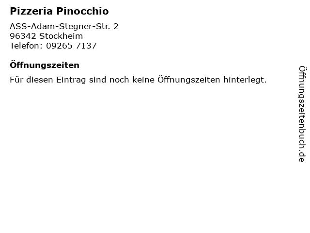 | Öffnungszeiten Pizzeria Pinocchio in Stockheim anzeigen | |