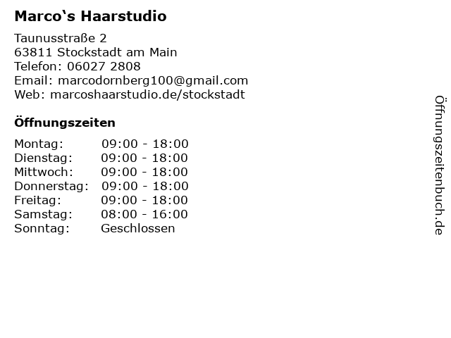 | Öffnungszeiten Marco‘s Haarstudio in Stockstadt am Main anzeigen | |
