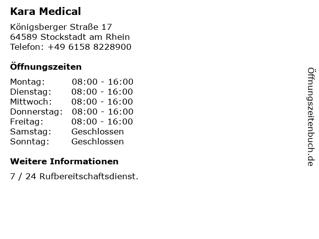 | Öffnungszeiten Kara Medical in Stockstadt am Rhein anzeigen | |