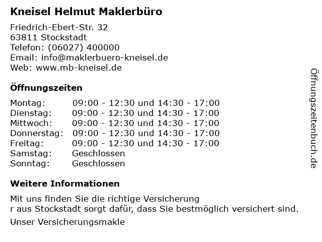 | Öffnungszeiten Kneisel Helmut Maklerbüro in Stockstadt anzeigen | |