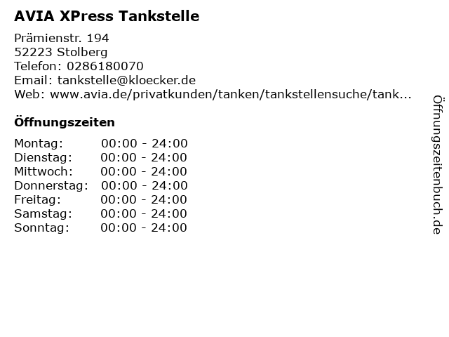 | Öffnungszeiten AVIA XPress Tankstelle in Stolberg anzeigen | |
