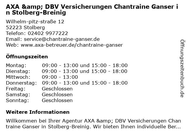 2 AXA Versicherung - Generalvertretung Chantraine & Ganser OHG (Entfernung: 0,01 km) Wilhelm-Pitz-Straße 12, 52223 Stolberg 5 AXA Versicherung Matros OHG in Stolberg (Entfernung: 3,64 km) Amselweg 23, 52223 Stolberg (Rheinland) 6 |