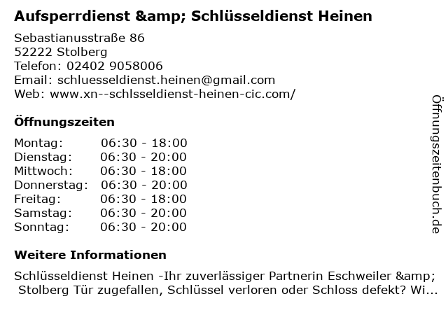 1 Mobiler Aufsperrdienst & Schlüsseldienst Heinen (Entfernung: 0,00 km) Sebastianusstraße 86, 52222 Stolberg 6 |