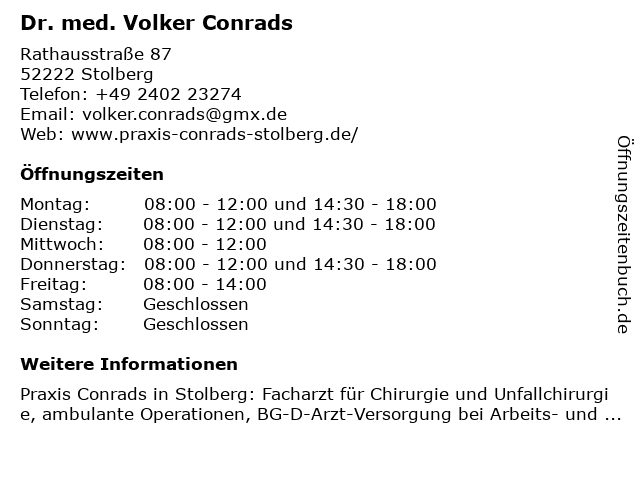 | Öffnungszeiten Dr. med. Volker Conrads in Stolberg anzeigen | |