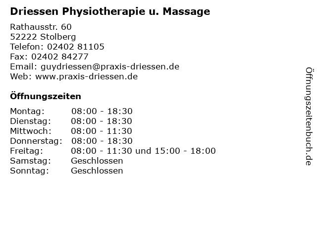 Branchen & Suchbegriffe zu Driessen Physiotherapie u. Massage:driessen, krankengymnasten, massage, masseure, physiotherapie, u. |