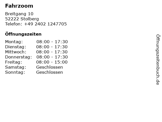 | Öffnungszeiten Fahrzoom in Stolberg anzeigen | |