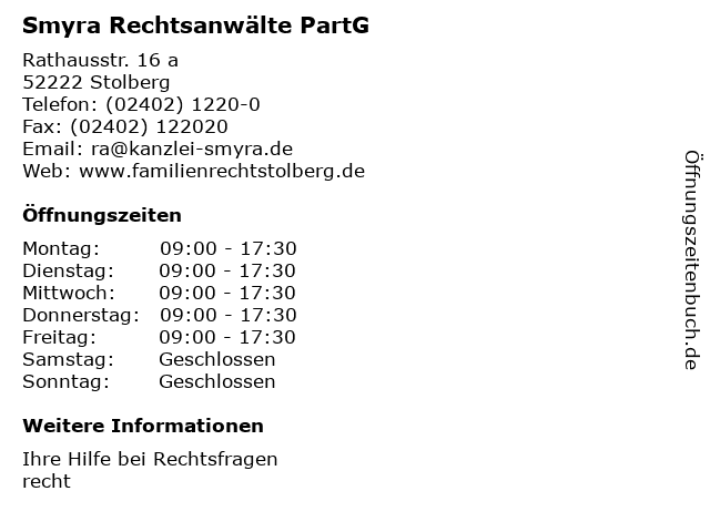 | Öffnungszeiten Smyra Rechtsanwälte PartG in Stolberg anzeigen | |