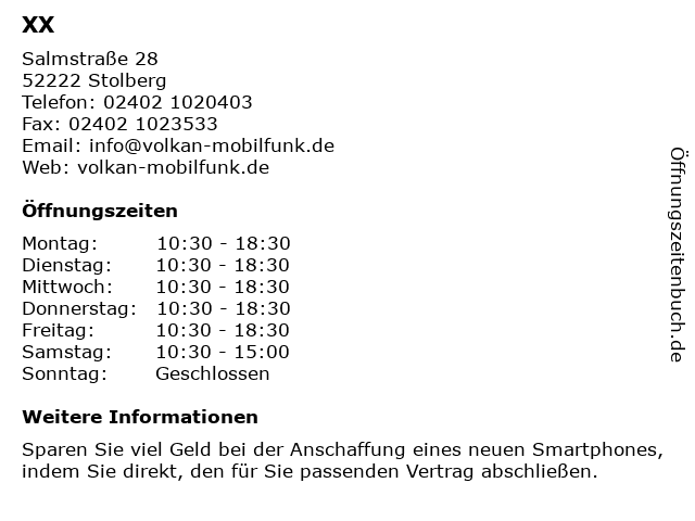 | Öffnungszeiten XX in Stolberg anzeigen | |