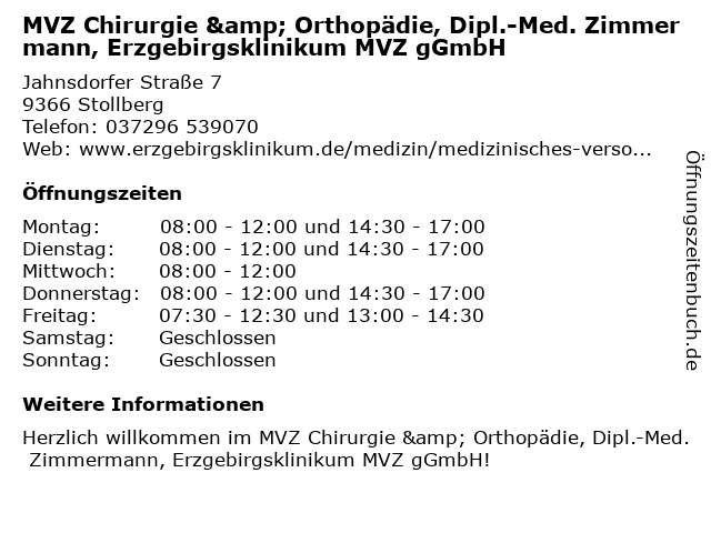 Branchen & Suchbegriffe zu MVZ Chirurgie & Orthopädie, Dipl.-Med. Zimmermann, Erzgebirgsklinikum MVZ gGmbH:chirurgie, dipl., erzgebirgsklinikum, ggmbh, med., mvz, orthopäden, orthopädie, zimmermann |