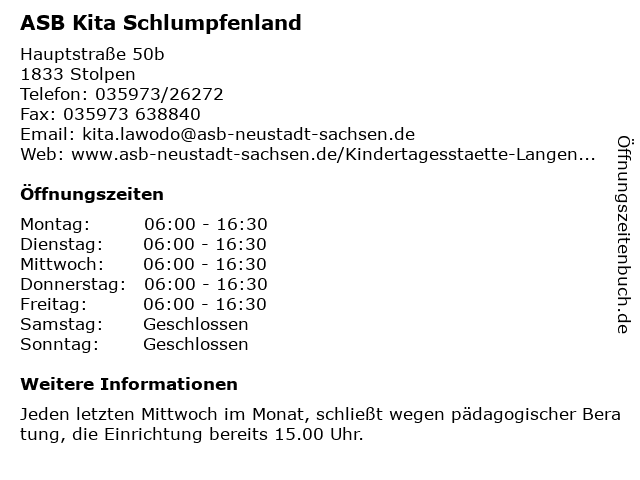 | Öffnungszeiten ASB Kita Schlumpfenland in Stolpen anzeigen | |