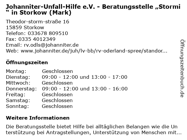 Branchen & Suchbegriffe zu Johanniter-Unfall-Hilfe e.V. - Beratungsstelle „Stormi“ in Storkow (Mark):beratungsstelle, e.v., gemeinnützige organisation, hilfe, hilfsorganisation, johanniter, mark, unfall, verband, wohlfahrtseinrichtung, „stormi“ |