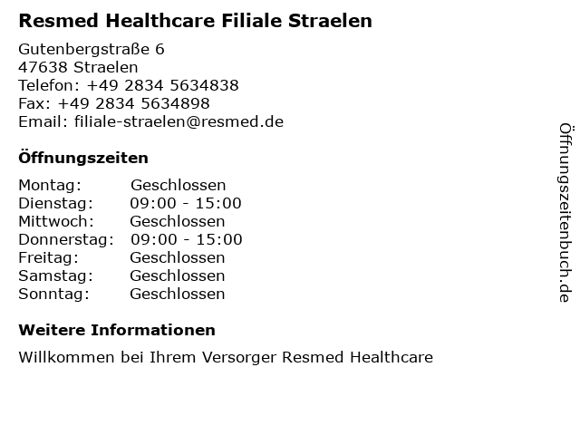 4 Resmed Healthcare Filiale Mönchengladbach (Entfernung: 28,65 km) Rudolfstraße 10, 41068 Mönchengladbach 6 Resmed Healthcare Filiale Düsseldorf Kaiserswerth (Entfernung: 36,37 km) Kreuzbergstraße 69, 40489 Düsseldorf |