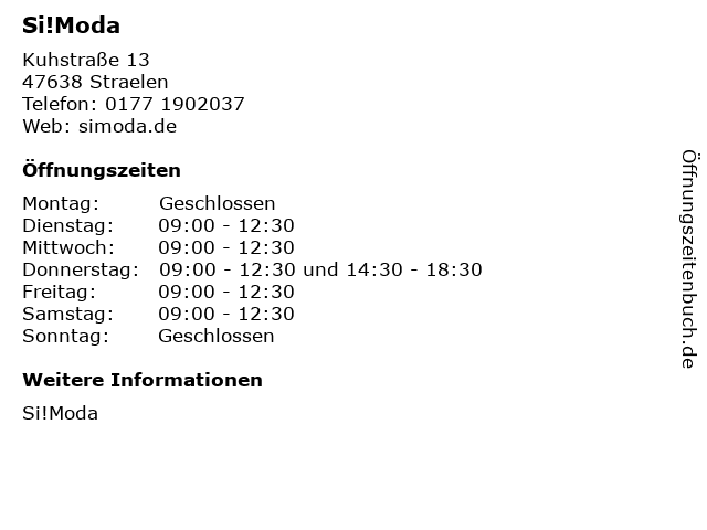 | Öffnungszeiten Si!Moda in Straelen anzeigen | |