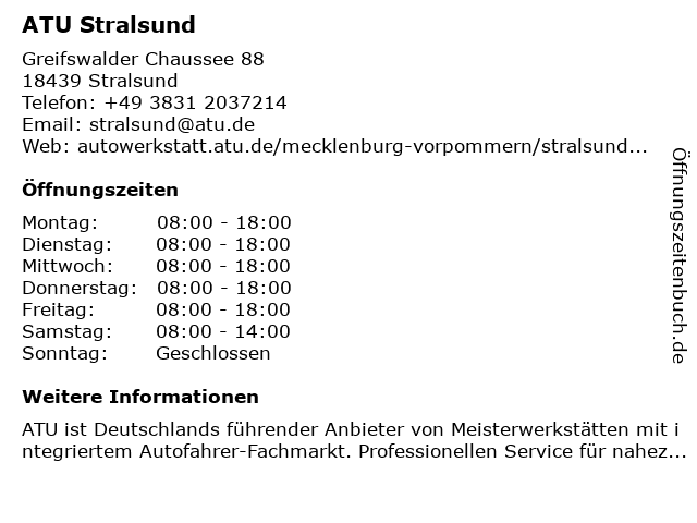 Öffnungszeiten ATU Stralsund in Stralsund anzeigen | |