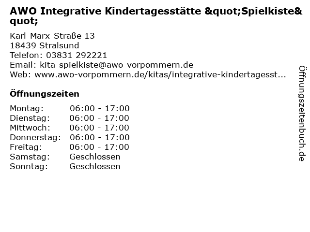 1 Kita Zwergenhaus - AWO Soziale Dienste Vorpommern gGmbH (Entfernung: 0,11 km) KarlMarxStr. 23, 18439 Stralsund 2 AWO Integrative Kindertagesstätte "Zwergenhaus" (Entfernung: 0,11 km) Gentzkowstr. 1, 18439 Stralsund 3 Kita Spielkiste - AWO Soziale Dienste Vorpommern gGmbH (Entfernung: 0,45 km) Frankenwall 24f, 18439 Stralsund 6 |