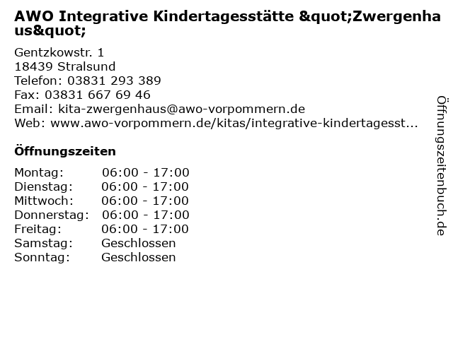 1 Kita Zwergenhaus - AWO Soziale Dienste Vorpommern gGmbH (Entfernung: 0,04 km) KarlMarxStr. 23, 18439 Stralsund 2 AWO Integrative Kindertagesstätte "Spielkiste" (Entfernung: 0,11 km) Karl-Marx-Straße 13, 18439 Stralsund 3 Kita Spielkiste - AWO Soziale Dienste Vorpommern gGmbH (Entfernung: 0,56 km) Frankenwall 24f, 18439 Stralsund 6 |