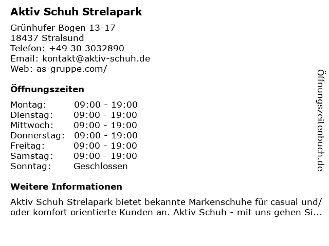 Öffnungszeiten Aktiv Schuh Strelapark in Stralsund anzeigen | |