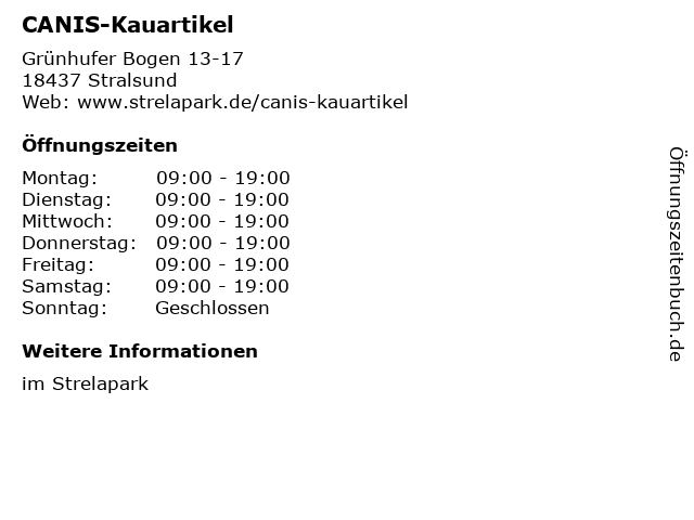 | Öffnungszeiten CANIS-Kauartikel in Stralsund anzeigen | |