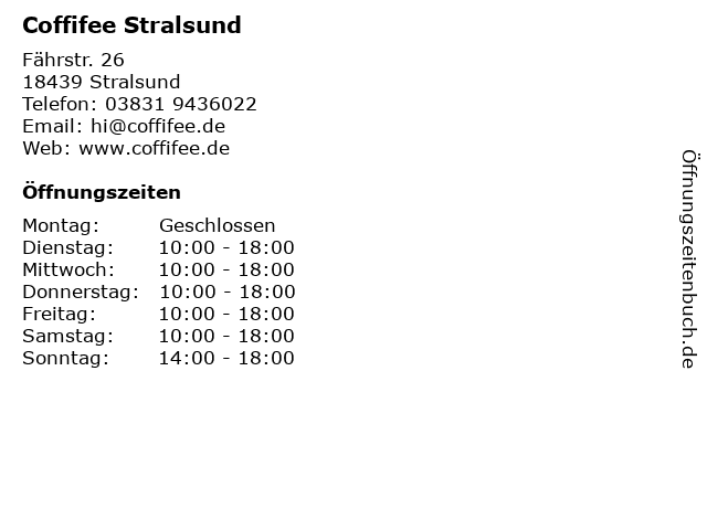 | Öffnungszeiten Coffifee Stralsund in Stralsund anzeigen | |