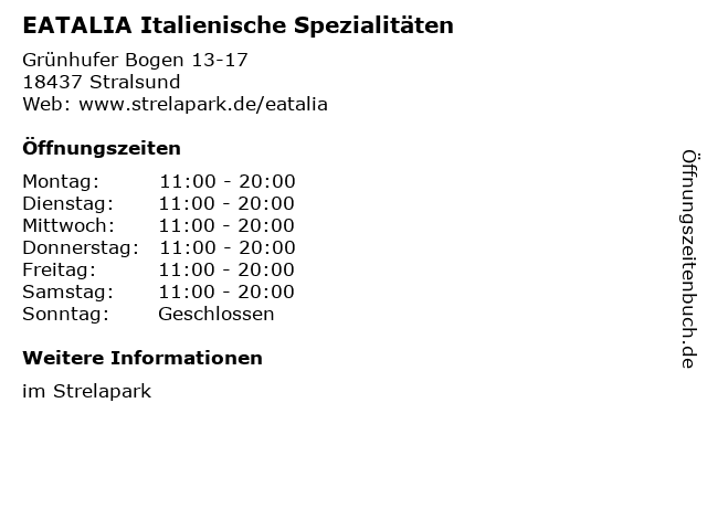 | Öffnungszeiten EATALIA Italienische Spezialitäten in Stralsund anzeigen | |