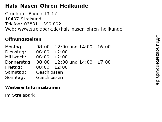 1 GYM Fitness World Fitness Studio GmbH (Hals-Nacken-Schulter) (Entfernung: 2,46 km) Tribseer Damm 76, 18437 Stralsund 2 Praxis für Hals- Nasen- Ohrenkrankheiten Dr. med. Bernhard Koch (Entfernung: 2,84 km) Marienstr. 2 -4, 18439 Stralsund 6 |