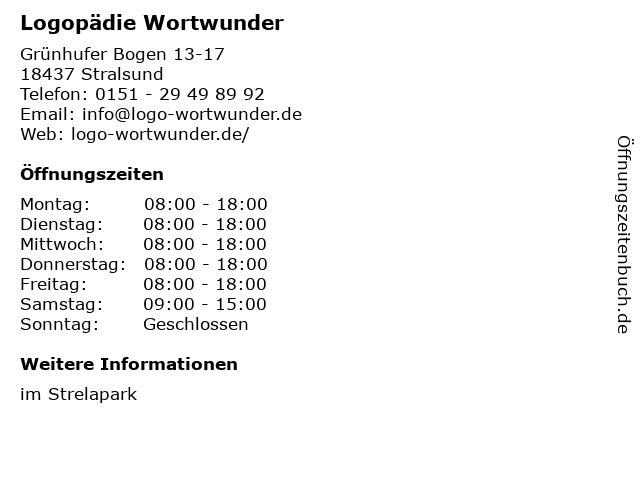 | Öffnungszeiten Logopädie Wortwunder in Stralsund anzeigen | |