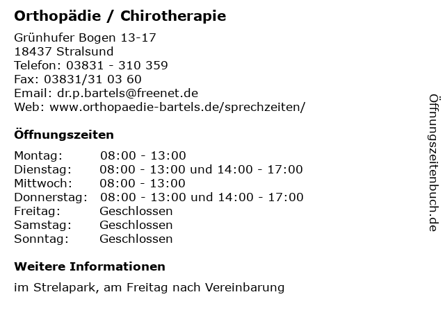 1 Dr.med. Peter Bartels Facharzt für Orthopädie (Entfernung: 0,04 km) Grünhufer Bogen 15, 18437 Stralsund 2 Dr.med. Michael Bartelt - Facharzt für Chirurgie, Orthopädie (Entfernung: 2,36 km) Heinrich-Mann-Str. 64, 18435 Stralsund 4 6 |