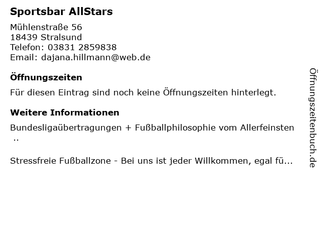 | Öffnungszeiten Sportsbar AllStars in Stralsund anzeigen | |