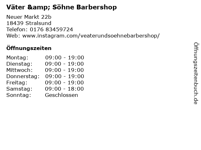 | Öffnungszeiten Väter & Söhne Barbershop in Stralsund anzeigen | |