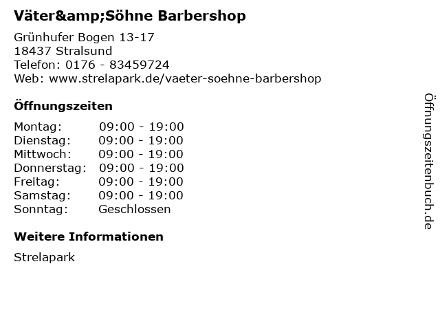 | Öffnungszeiten Väter&Söhne Barbershop in Stralsund anzeigen | |