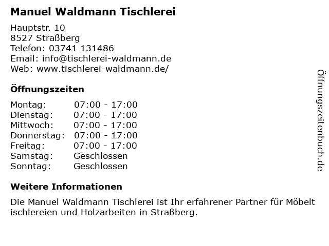 | Öffnungszeiten Manuel Waldmann Tischlerei in Straßberg anzeigen | |