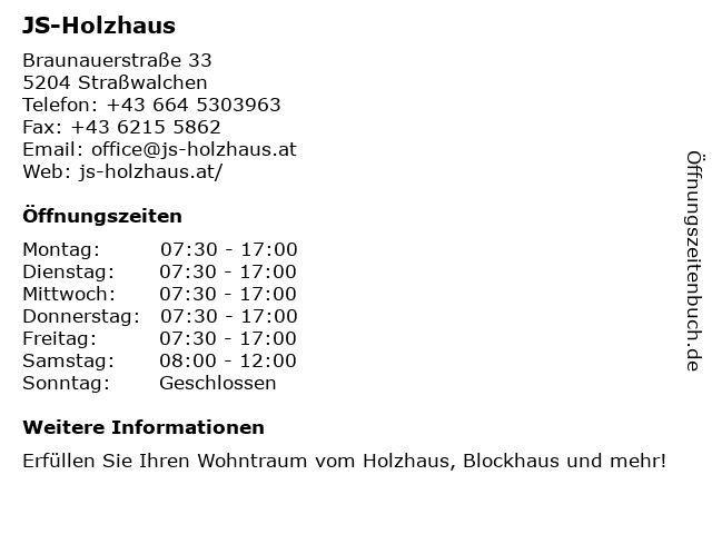 | Öffnungszeiten JS-Holzhaus in Straßwalchen anzeigen | |