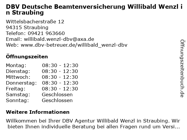 Branchen & Suchbegriffe zu DBV Deutsche Beamtenversicherung Willibald Wenzl in Straubing:autoversicherung, beamtenversicherung, berufshaftpflichtversicherung, dbv, deutsche, gebäude- und hausratsversicherung, lebensversicherung, unternehmen für versicherungsfachfragen, wenzl, willibald, zahnmedizinische versicherung |
