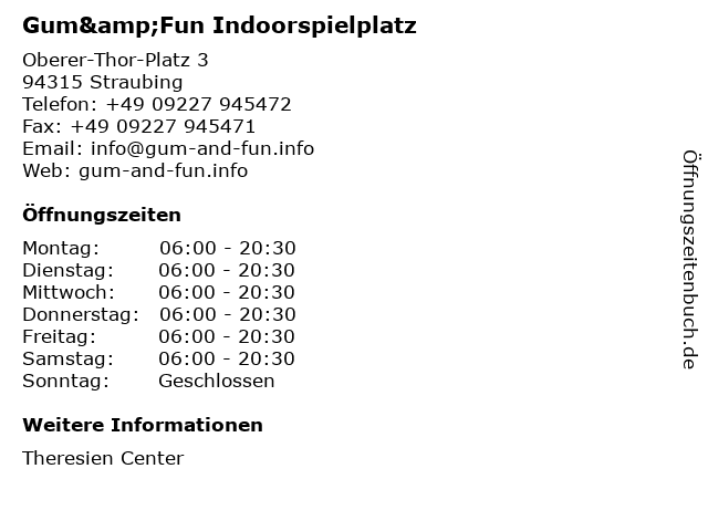 | Öffnungszeiten Gum&Fun Indoorspielplatz in Straubing anzeigen | |