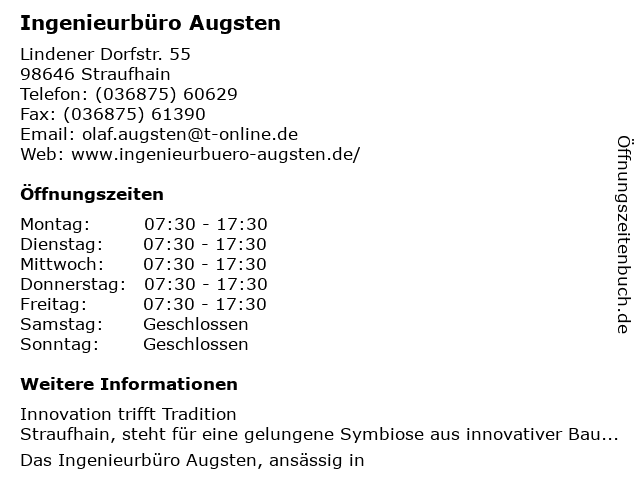 | Öffnungszeiten Ingenieurbüro Augsten in Straufhain anzeigen | |