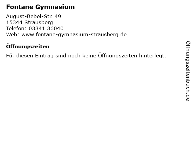 | Öffnungszeiten Fontane Gymnasium in Strausberg anzeigen | |