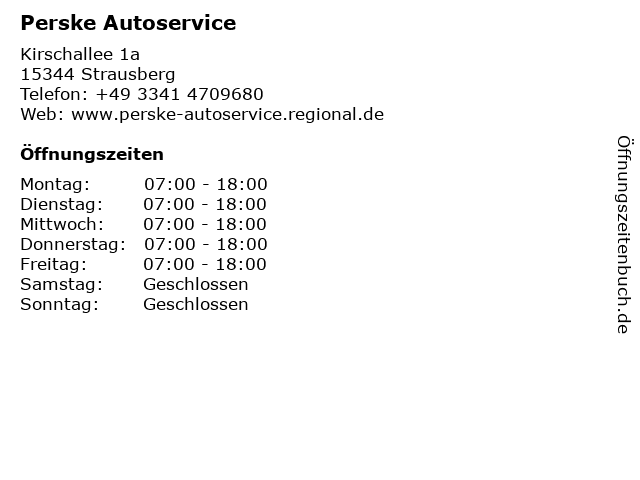 | Öffnungszeiten Perske Autoservice in Strausberg anzeigen | |