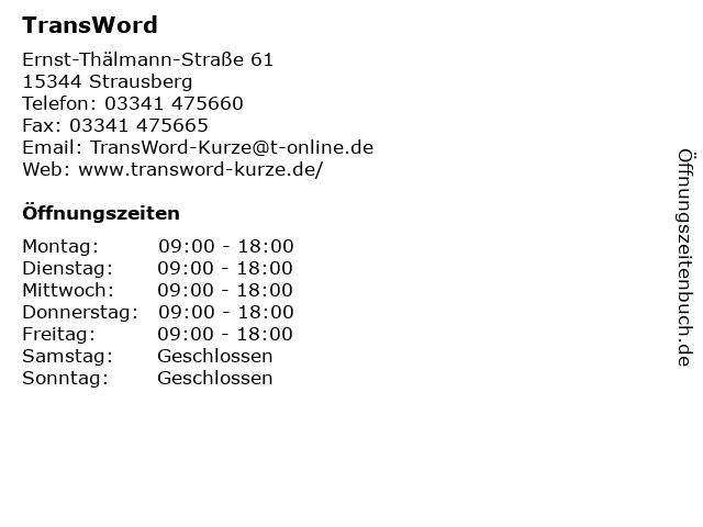 | Öffnungszeiten TransWord in Strausberg anzeigen | |