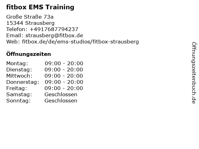 | Öffnungszeiten fitbox EMS Training in Strausberg anzeigen | |