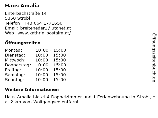 | Öffnungszeiten Haus Amalia in Strobl anzeigen | |