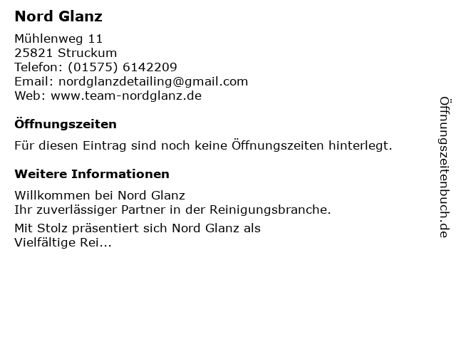 | Öffnungszeiten Nord Glanz in Struckum anzeigen | |
