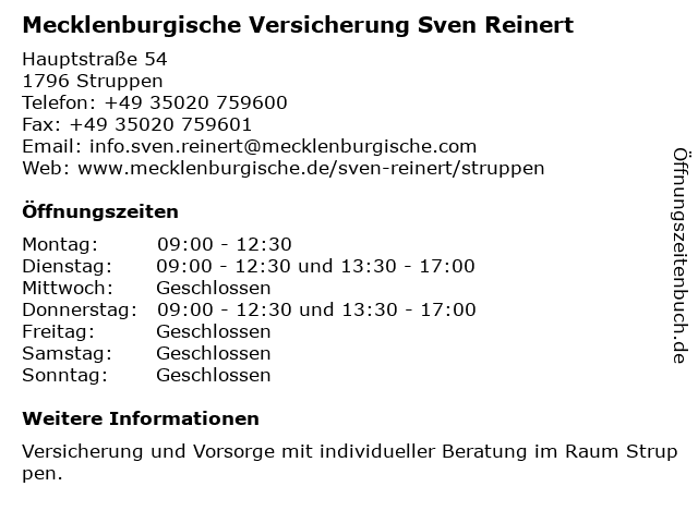 3 Mecklenburgische Versicherungsgruppe - Hauptvertretung Sven Reinert (Entfernung: 4,90 km) Schloßpark 13a, 01796 Pirna 5 Mecklenburgische Versicherungsgruppe - Generalvertretung Hartmut Schulze (Entfernung: 5,54 km) Schloßstr. 5, 01796 Pirna 6 Mecklenburgische Versicherung Johannes Hartmann (Entfernung: 5,59 km) Königsteiner Straße 26, 01796 Pirna |