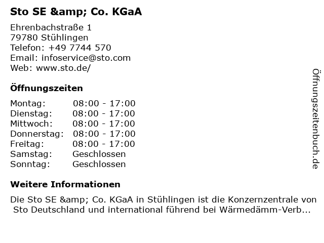 | Öffnungszeiten Sto SE & Co. KGaA in Stühlingen anzeigen | |