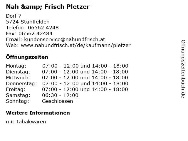 | Öffnungszeiten Nah & Frisch Pletzer in Stuhlfelden anzeigen | |