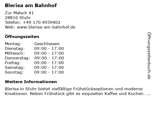 | Öffnungszeiten Blerisa am Bahnhof in Stuhr anzeigen | |