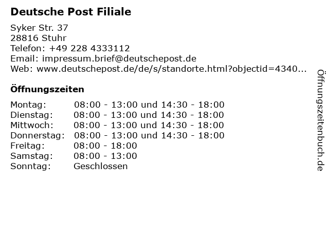 Öffnungszeiten Deutsche Post Filiale in Stuhr anzeigen | |