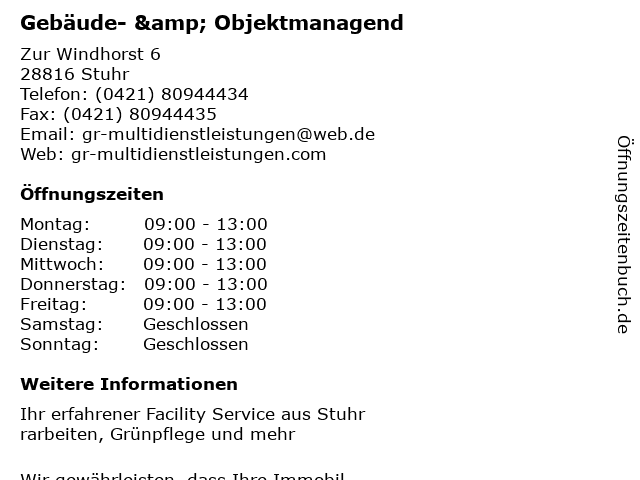 Öffnungszeiten Gebäude- & Objektmanagend in Stuhr anzeigen | |