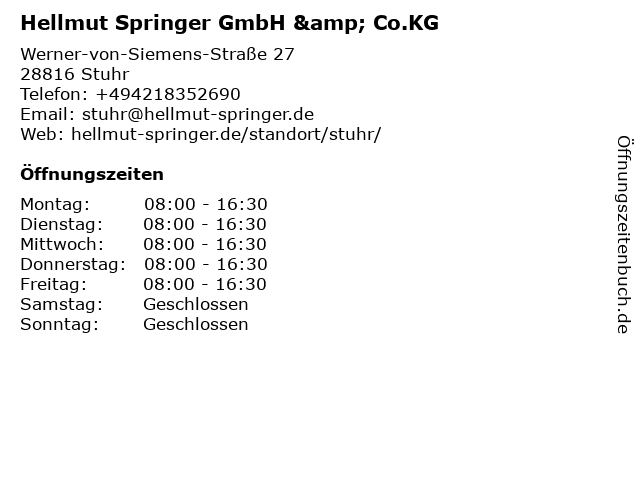 | Öffnungszeiten Hellmut Springer GmbH & Co.KG in Stuhr anzeigen | |