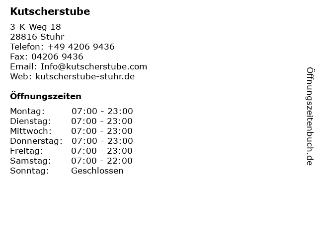 | Öffnungszeiten Kutscherstube in Stuhr anzeigen | |