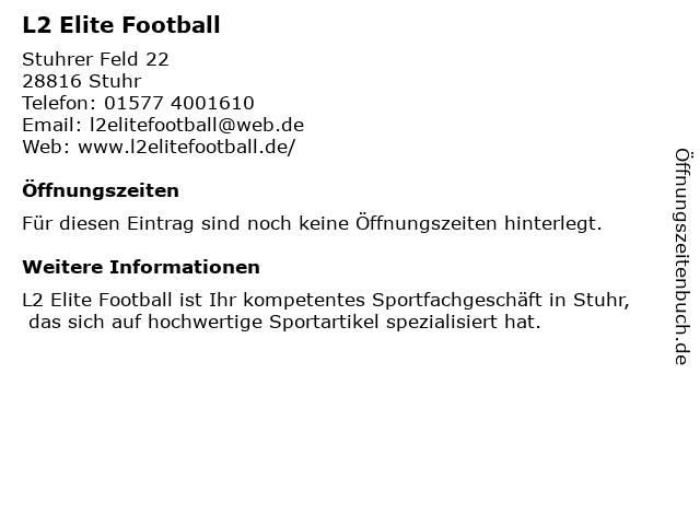 | Öffnungszeiten L2 Elite Football in Stuhr anzeigen | |